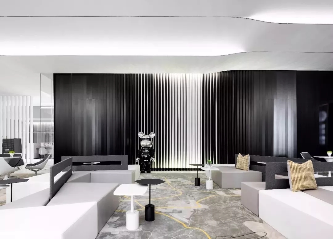 時尚動感的弧形線條可以輕鬆勾勒出科技感;整個空間不能太過繁雜,需要自然流暢、同時擺脫沉悶感,置身其中仿佛漫步在未來時空。